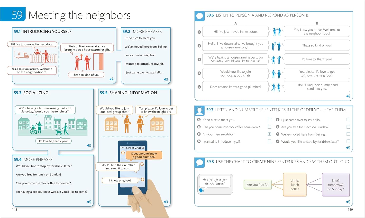This engaging and accessible book covers a wide range of real-life topics and scenarios – from everyday activities, such as going to the supermarket and making appointments, to key communication skills, such as comforting someone and dealing with conflict. You’ll learn how to welcome visitors, ask for directions, give a presentation at work, find somewhere to live, order a meal out, and much, much more.